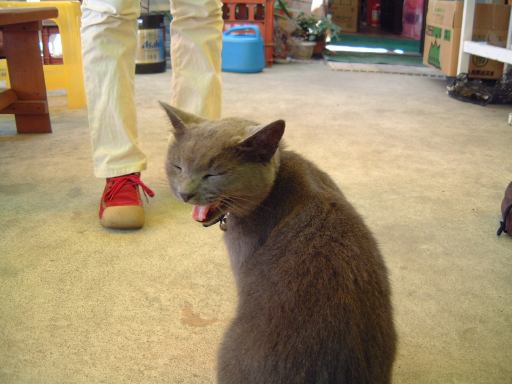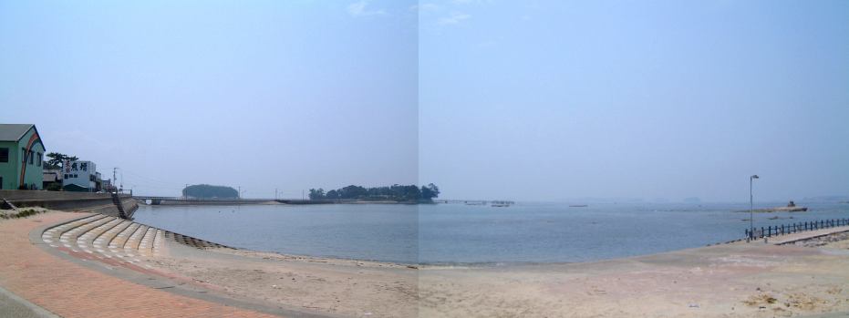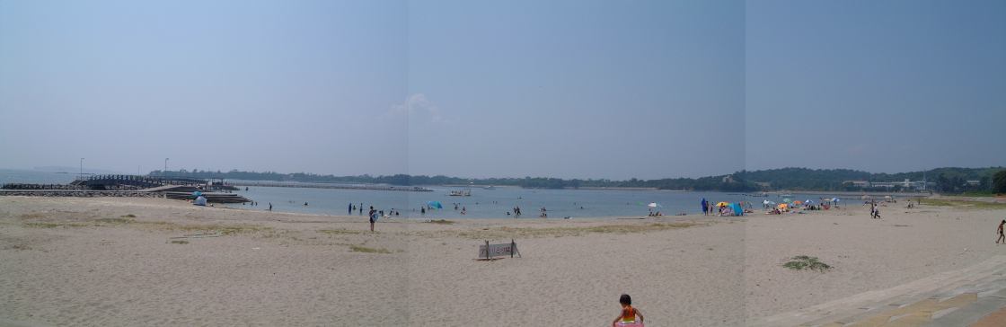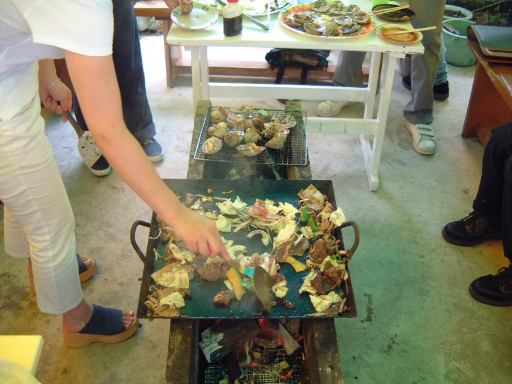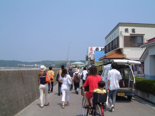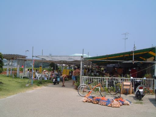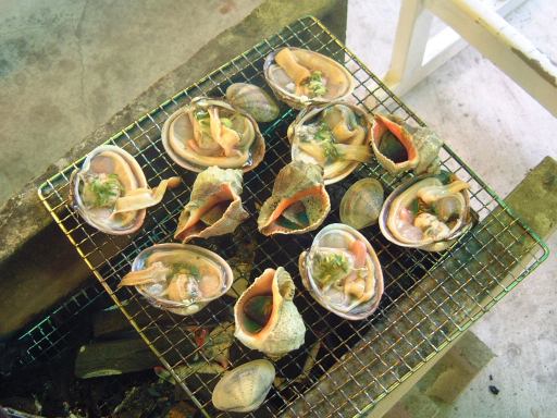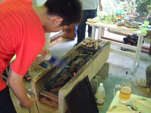 渡船場からは防波堤内の海沿いの道を歩いて、バーベキュー会場が用意されているという大浦海水浴場を目指しました。途中には旅館や飲食店が数軒並んでいます。しばらく進むと、やがてバーベキューの予約をしておいたみぎわさんの建物が現れました。が、とても営業してなさそうな趣き。いくらなんでもここではないだろうと判断し、とりあえず海水浴場の方へ移動。防波堤を抜けると左手にはこんな景色が広がり、右手に数軒の店が軒を並べている休憩所がありました。そしてこの中にちゃんとみぎわさんの店鋪も存在(良かった良かった)。さっそく予約席に通してもらって本日のメインイベント、バーベキューパーティの開始です。とりあえずの飲み物はGんてつさんとAなあなさんと私だけがビールを注文(これは別会計)、その他の方はMつるさんご持参のお茶などを飲まれていたでしょうか。店のお姉さんに火を起こしてもらって、さっそく金網のうえで大アサリなどの貝類を焼きつつ、隣ではAさんが火を育ててくれました。特に改まった挨拶もなく流動的にバーベキューは始まっていましたね。ふと足元を見ると、いつの間にか猫がにゃ〜とやってきて何かを訴えています。しかし、こいつらじゃ何ももらえそうにないと判断したのか(笑)すぐに店の奥に引っ込んでいきました(それ以来姿を見せませんでしたね)。