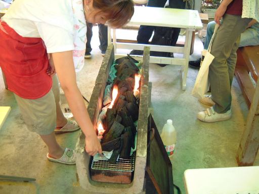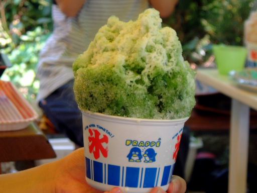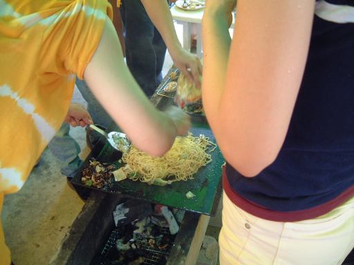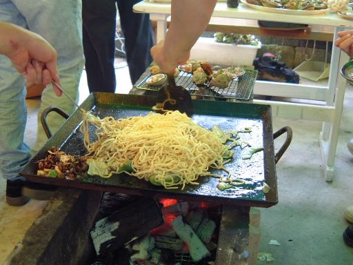 そんなこんなで充分炭に火が回ったところで、鉄板を上にかぶせ、油をひいて、肉やら野菜やらをガンガン投入。最初の頃鉄板のお守をしてくれていたのは主にAさんでした。餃子の皮作りのときもそうでしたが、こういう作業ではAさんが大活躍します(笑)<こらこら「では」って言うな。いつもご苦労様です。そしてみんなは頃合を見計らって順次ワイワイと食べていきました。貝類のやけ具合はこんな感じで、肉と野菜がこんな感じ。う〜ん、少々油っ濃いけど、海のそばで汗をかきかき熱いものを食べるのはまあ格別です。ビールも美味しく感じます。個人的に肉は食べないので肉の味はどうだったのか判りませんが、雰囲気を含めればまあまあの味だったと思われます(<嘘でも美味しかったと言えんのか<嘘なのか)。必死で炭の火を保ちつつ夢中で肉・野菜・貝を焼きつつ食べているときは、「すべてがFになる」のこともすでに意識の端に追いやられていましたが、後半にいよいよ焼そばが投入される段階になって、そうだそうだそうだった、とようやく本来の目的を思い出しました。そう、「佐久島で、バーベキューで、焼そばを食べる」これは今回のオフでは外せない重要課題なのです。こんな海岸を前にして泳がないことがあっても焼そばはぜひとも食べなければいけません。参加者の中には、萌絵のように焼そばを初めて食べるという人はさすがにいませんでしたけど、バーベキューの焼そばは久しぶり〜という人がほとんどでしたね。最初に焼いてくださったのはGんてつさんで、一度にこれくらいの量がさばかれました。その後私も焼かせていただいたりして、なんとかすべての焼そばが消費され、若干のお肉と貝類を残してバーベキューはほぼ終了。そしてデザートタイムです(にっこり)。火照った胃を休めつつ、この店で売っていたかき氷(これは抹茶か)を何人かが食べることに。紫色したシロップのやつを少し分けていただきましたが、普通のレモン風味でしたね。あと、まだ渡していなかった方にここで名刺をお渡ししたり、Gんてつさんの持ってこられたキャストパズルにLさんが挑戦されたり(しかし解けず)、Aなあなさんが行きしなに金山駅で買ったはいいけど食べる機会を逸したままお腹いっぱいになって食べれなくなったというおにぎりを、最後に焼きおにぎりにして食べることになったり(私がね)、まったりとしたひとときを過ごしました。焼きおにぎりはバーベキューのタレをかけて焼いてみましたが、焼き過ぎてちょっと堅かったです。