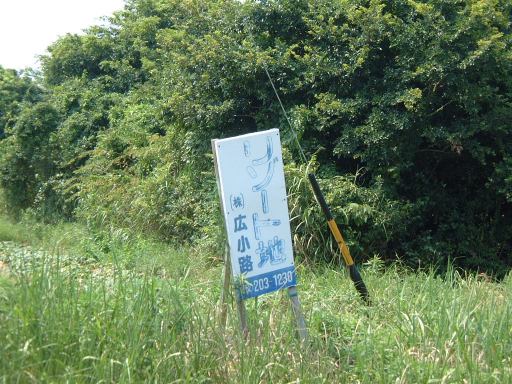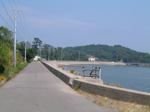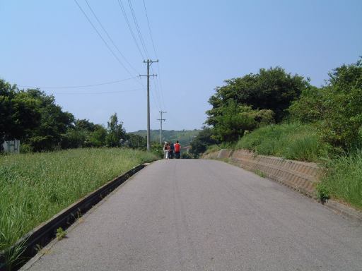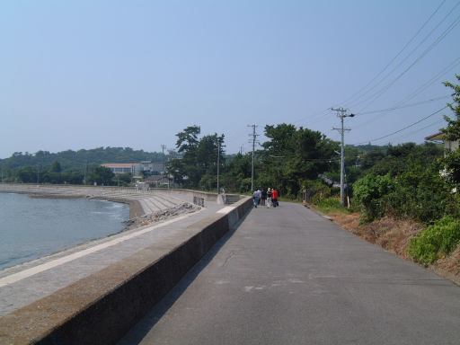 さて、これで本日のメインイベントは終わりです。正直この島は、日帰りで楽しめるところは海水浴場を除けばほとんどない長閑な島なんですね〜(笑)。かといってすぐに帰ってしまうには早い時間です。まだ午後1時過ぎ頃だったと思います。というわけでちょっとした協議の結果、お腹いっぱいになってみぎわさんをあとにした一行は、西の渡船場までぶらぶら島内を歩いて横断することになりました。したがって以降の写真は長閑な風景ばかりとなることをあららこめご了承ください。歩いたのは、おそらく島の南側のメインストリートであろうこういう田舎道です。長閑な景色を見ながらひたすら歩いていきました。軽いアップダウンもありますが、基本的に海岸沿いでは平坦な道が続きます。陽射しは相変わらず強く、日なたでは肌がジリジリと焼けていきます。「今は夏。我らはそれを思い出す。」ってところでしょうか(思い出すも何も、忘れられないくらい暑いのですが)。ちょうど中間地点くらいにあった小学校の前には島の案内板があり、どんな場所があるのかを少し確認。再びもし訪れることがあったときのためにね。キャンプ場もあるようで、今回はやむなく夏に来たけど今度は涼しいときに来てキャンプするのも良いかもしれない、という話も出たり。近くの海岸にはまたしてもそそられる露頭があったのでここに一枚(地質マニアに捧ぐ再び)。振り返って海岸線を一枚。