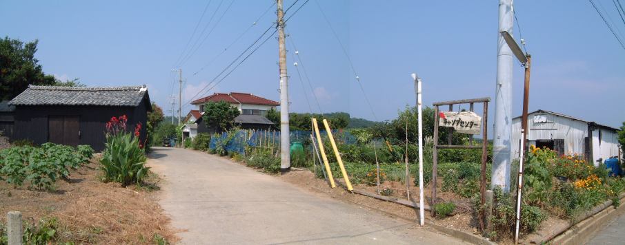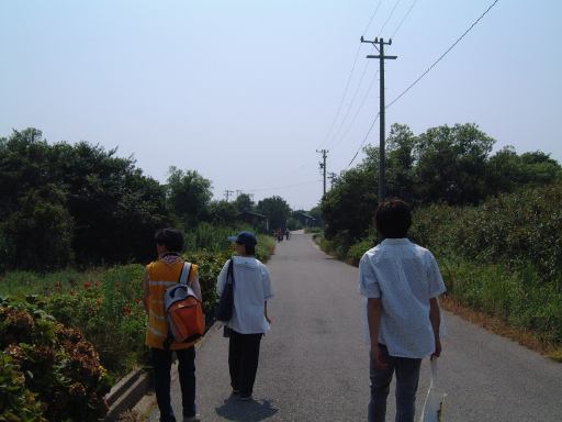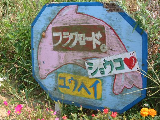 さらに田舎道を歩いていくと海からは若干遠ざかり風が届かないようになって暑さ倍増でしたが、まあ慌てず急がずのんびり歩きます。特に目を見張るものはないですが、ふと道路脇を見れば、板の小さな穴から伸びる、島の逞しい植物を発見できたりします。件のキャンプ場へ続く道を通り過ぎ、しばらく進むと現れたのがリゾート地。ほう、なるほど、ここがリゾート地か(笑)。別荘でも建てられるのかもしれません。また畑らしきところにはこんな看板もありました。ショウコさんとユウヘイさんの「フラワーロード。」らしいです(イルカの鼻あたりに蝉の抜け殻付き)。そして我々が歩いているのはフラワーロードではなくて、しつこいですがこんな田舎ロード(ほんのり「スタンド・バイ・ミー」風味)。前方のグループと後方グループの差が開いてしまって、ときどき前方グループが日陰で待ってくれていたりします。追いついたところで行く先を見たのがこちら(相変わらずただの道ですが空は広い)。さらに先へ進んでいくと、遠くの方にこんな建物を発見。おお、きっとこれがあの真賀田研究所に違いないと勝手に妄想(笑)。まあ後ほど、実際は青少年キャンプセンターであったことが判明しましたが。ちなみにそこへと続く道は1本だけではなくここにもありました。そして再び遅れ気味だった後方グループが前方グループに追いついて合流の図。渡船場はもうすぐです。海が近づいてきて風も吹いてきました。終わりが近いと心なしか足取りも軽やかになるように感じます。いつの間にか少しだけ海水面よりも高いところを歩いていたらしく、渡船場への道は下り坂でした。その途中にはなんとこんなに大きなパイナップルが埋まっていました(笑)。坂を降りると今度は方言で歓迎の看板があり、午後2時頃、西渡船場に到着(Gメン風)。