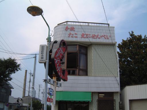 帰りはちゃんとこういう歩道を歩いて土手を川上に進みます。この歩道から見おろせる大きな用水路にはときどき大きな亀がぷかぷかしていましたが、残念ながら写真には撮れませんでした。駅に戻る前に一色町名物らしいえびせんをお土産にしようと、通り道にあったえびせんべい屋に寄って、買いたい人は思い思いのせんべいを購入。ポテトチップスのようにはいかず、どれも結構な値段がしますね。ちなみに私はお手ごろ価格だったイカ鉄板焼を買いました。全然関係ないですが店の向かい側にはカツオ君を発見。店をあとにして駅に着いたのが午後4時で、あと10分で電車でもなく列車でもないディーゼルカーのワンマンカーがやってくるという時間でした。グッタイミンです。空を見れば馬頭星雲を彷佛とさせる(させない?)こんな雲。10分も悠久の時のように感じられます。ワンマンカーを待つ間、駅前の当たりくじ付きの自販機で飲み物を買う人もいたのですが、聞くところによるとその自販機はしゃべるタイプのものらしく、言葉遣いがやけに丁寧だったそうな。まあそれくらいしかネタがない三河一色駅なわけですが(<馬鹿にしてるのか?)、そうこうするうちにワンマンカーがやってくる時間となりました。ここで一色町出身のAすましさんとはお別れとなり、残りのメンバは無人の改札を通ってホームへ。やってきたワンマンカーに乗り込みました。