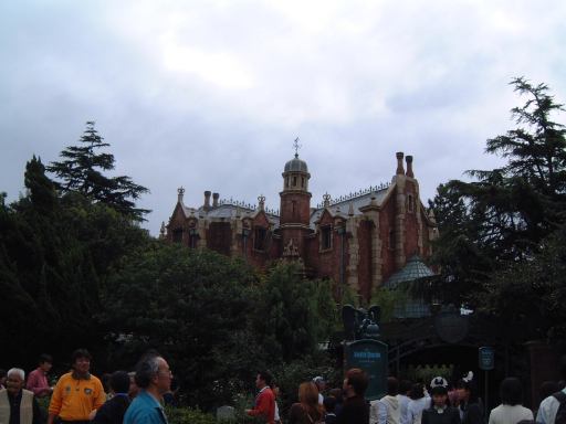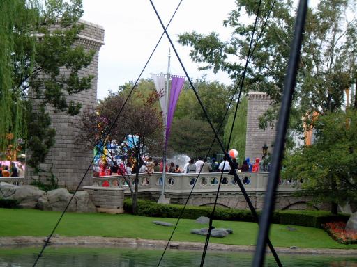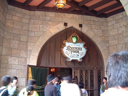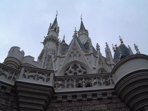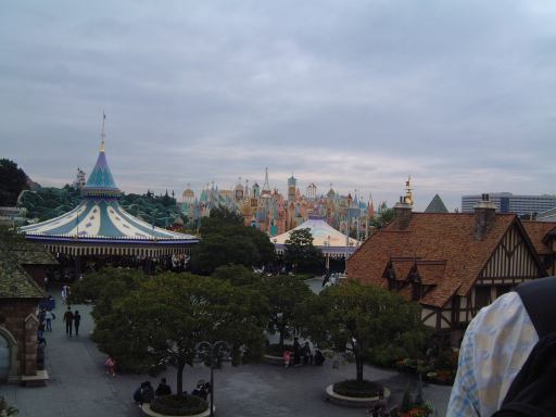 今回の悩みどころだったメインイベントの「ドナルドのスーパースプラッシュ」での「ずぶ濡れエリア」確保は、天気と気温を考慮して諦めることになりました。そう、天気はこんな具合にどんよりだったのです。というわけで、まずはもうひとつの選択肢だった「プーさんのハニーハント」のファストパスをゲットするのが最初の目標となりました。だからまあ、ランド内に入ってからも慌てず騒がず早足程度で奥へ進み、ファストパスの列に並んだしだいであります。いざ並んでみたところ、前回よりも断然短い待ち時間(30分待ちぐらい)でした。なんだかんだおしゃべりをしながら首尾よくファストパスを手に入れた一行は、さてどこにいこうかと迷いました。決めてなかったんか!(笑) まあ、その程度です。全アトラクション制覇とかを望んでいるわけでもないので、ドナルドのパレードを見ることとハニーハントに乗ることぐらいしか、プランは立てていませんでした。流れに身を任せてぶらぶら歩くのもまた一興です。で、辿り着いたところがシンデレラ城(近過ぎ)。その内部で行なわれる「ミステリーツアー」が最初のアトラクションとなりました。実はこのアトラクションは初めてです(わくわく)。20分ほど並んで入りましたが、いやあ、噂通りのお姉さん(お兄さんもいるのかな)の過剰な演技が素敵ですね(笑)。観られて嬉しいです。いまいち反応の弱い客相手に怯むことなく、淡々とアニメ声で演技を続けるお姉さんは、さすがプロだなあと感慨。いつかお姉さんの演技に負けないくらいの反応をこちらもできるようにしたいものです(みんなでやれば怖くない?)。ちなみにラストの光の剣(ネタバレ)を装備したのは男の子でした(関係ないですが某S都さんは光の剣を装備したことがあるという噂を聞きました)。城から外に出るとこんな景色が見られます。曇ってますね。