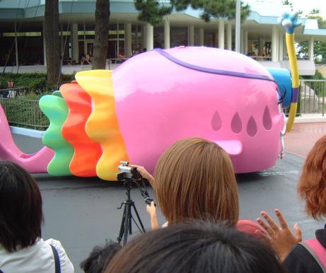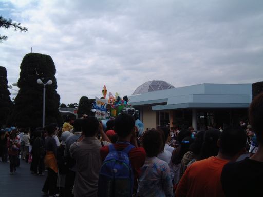 その次に向かったのが「ホーンテッドマンション」で、相変わらずお姉さんのメイド姿には萌え萌えです、Mつるさんがね(笑)<責任転嫁か! えっと、ここもあっさり10分待ちぐらいで亡霊とお友達になれました。マンションから出ると11時を回っていて、そろそろ「スーパースプラッシュ」が始まりそうな雰囲気だったので、シンデレラ城の方からトゥモローランドへ向かいました。その途中、もみあげの長いプレスリィ風の衣装をまとったハンサムなお兄さんが歩いているのを発見。女の子たちに記念写真をせがまれています。なんだなんだ?あんなキャラクタ、ディズニーにいたか?と疑問に思っていたら、そのお兄さんはシンデレラ城前の「スーパースプラッシュ」のずぶ濡れエリアに向かって行き、そこでようやく、ああはいはい、あのドナルド相手にマイクパフォーマンスをする人かと気づいて人気ぶりを納得。単なるハンサムでも写真をせがまれたりはしないもんね。どうりで人気があるわけです。そのお兄さんの背中を見送る形で、我々はパレードの通路整備に阻まれ、橋の手前でショーの観賞をすることになりました。