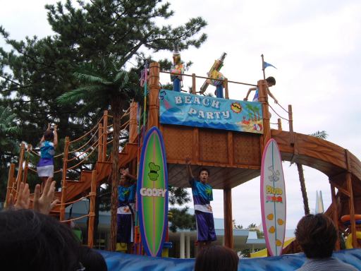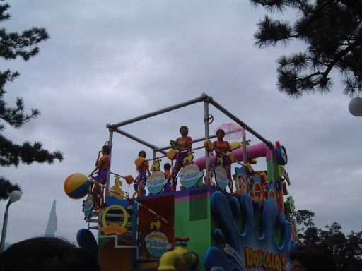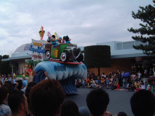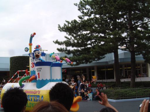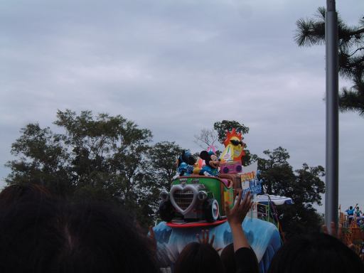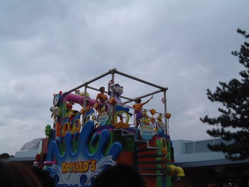 しばらくすると、どこからともなく音楽が流れ始め、「ドナルドのスーパースプラッシュ」の山鉾巡行が始まったようです。シンデレラ城へ向かっていくパレードの先頭を切って現れたのは、ダンサーのお兄さんお姉さんたちでしたが、その後ろからやってきたのはこの方たちでした。そう我らがミッキー&ミニーでーす(テーマパーク紹介番組風)。サーフボードの上に車ごと乗るなんていう無茶なことできるのはこの方たちの他にいないでしょう(笑)。その後ろには何故かシュノーケルを付けたお魚さんが続き、潜水艦に乗ってやってきたのがドナルド・キッズ(勝手に命名)の3人組。水をまき散らしてます。そしてついに現れた本日の主役ドナルド・ダックはお姉さんたちと一緒に高台に。さて、ここでミッキーマウスたちがすでに辿り着いたらしいシンデレラ城前を見ると、間にある柳の木が邪魔でよく見えません(しょぼ〜ん)。ドナルドたちも合流し、いよいよスーパースプラッシュが始まっても、確認できるのは水をかけられている人々の悲鳴と、水鉄砲から飛んでいく水の軌跡ぐらいです。フィナーレのザッパ〜ンも見れました。ショーが始まってしまうといいなあいいなあと恨めしそうに眺めることしかできませんでしたが、その一方で、この天気でびしょ濡れになるのは寒そうだし、やっぱり濡れなくて良かったなあと思うのでありました。水鉄砲だけでなくシンデレラ城の上からも放水されていましたからね。ショータイムが終わり、ミッキーたちは再びパレードをしながら引き上げていきます。もう少し近寄ってくると、二人揃ってこっちを見たり、愛想が良いですね。お兄さんたちも手を振りながら去っていきます。ドナルド号のお姉さんたちは笑ながら水かけてきます。それを受けてるお客さんも笑顔です。ドナルド・キッズは帰りも派手に水を撒いてくれました。メインのショーは遠くからしか観られませんでしたが、パレードは観られて水も程よくかけられて、まあまあ満足のいくショーでした(にこにこ)。