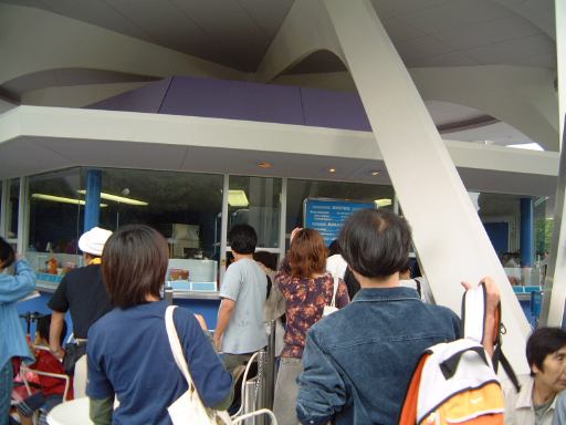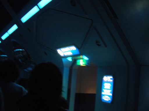 それから再びトゥモローランドへ戻り、「ミクロアドベンチャー」のファストパスを取り、KずえさんとMつるさん以外のメンバは「スペースマウンテン」の列に並ぶことに。15分待ちだったのですぐに動く坂道前まで辿り着き、間もなく坂道を上昇。建物内部に入ると、道を進むごとにだんだん暗くなっていきます。途中で断念する人用の非常口が度々設置してあるのが面白いですね。そんなに凄い乗り物なのかと期待してしまいます。実はこれも今回初めて乗ることができたアトラクションなんですが、実際乗ってみると、うーん思っていたよりも上下の移動が少ないコースタでしたね(横Gはまあまあだったけど)。暗闇の中を走るというので、宝塚ファミリーランドにあった同じように暗闇の中を走る「スペースコースター」のようなものを想像していたので(って判る人いるのか?)、個人的にはちょっと物足りない感じでした。まあ、この寸止め感が、良くも悪くもディズニー的なテイストなのかもしれません(寸止めじゃないのってスプラッシュマウンテンくらいか)。ただ、走ってる途中に下の方のレールが見えてしまうのはちょっと興醒めてしまうので、やるなら徹底的に真っ暗にしてほしいなあと思いました。