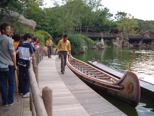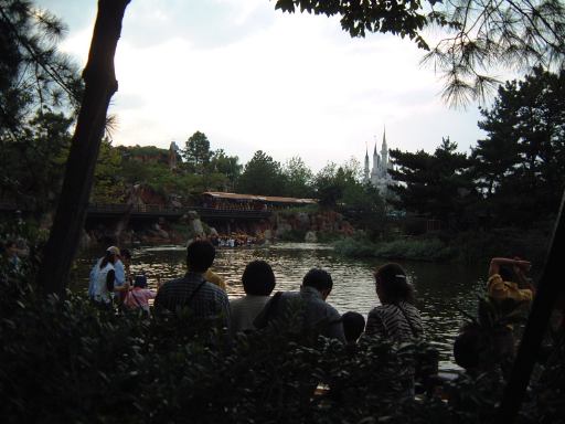 そのあとはアドベンチャーランド側に移り、「カリブの海賊」を待ち時間なしで楽しみました(何度乗ってもダークなイッツ・ア・スモールワールドという印象だなぁ)。でもって「ビッグサンダーマウンテン」のファストパスを取り、クリッターカントリーの「カヌー」へ行ってみるも、50分待ちだったためひとまず諦めて小休憩を取ることに。売店でコーヒーやらソフトクリームやらを買い、木の椅子に座って食べました。ついでに今後我々が進むべき道を話し合います(といっても適当に)。その後もう一度「カヌー」を覗いてみると、30分待ちに列が減っていたので、よし並んでしまえと並んで、湖見ながら時間は経ち、4時過ぎには乗ることができました。船乗り場はこんな感じ。写真からも判ると思いますが、並んでいたのはグループの一番前でした。つまり、それでかけ声をかける役をやらされたのです(ああ恥ずかしい)。しかしこういうときに騒ぐのが体育会系の血というのでしょうか。真面目にかけ声かけて、ついつい真剣に漕ぎ過ぎて、その結果思わぬところでずぶ濡れです(笑)。乗せられて楽しむアトラクションもいいですけど、こういう能動的なアトラクションはノリノリで乗ると結構楽しくなりますね。良い運動になりました。