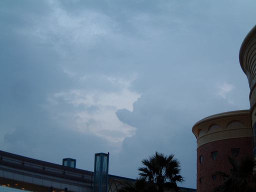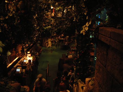 そろそろ夕食時だったため、それからは一路ゲートに向かい、再入場用のスタンプを手の甲に捺してもらって一旦園外へ。途中空にピノキオ(?)を発見しつつイクスピアリまで行って、その中にあるレインフォレストレストランというところで食事となりました。壁やら天井などに植物が生い茂り、ゴリラやオウムの人形が方々に居て、その名の通り熱帯雨林みたいな雰囲気のレストランです(しかし気温だけは亜寒帯みたいでした)。時々その動物たちが動きだし、照明が暗くなったりして落ち着かない中、ピザとパスタとサラダをみんなで分けて食べました。飲み物はアルコール入りのコーヒー「カフェマンボ」を頼んでみましたが、これが暖かい飲み物で新鮮な感覚。しかしアルコールがきつめで焼酎のような味わいでした。料金は消費税込みで6人全部で1万円ちょっとでしたが、なんと1万円を越えたグループには先着500名にオリジナルTシャツがプレゼントされるらしく、我々も1着もらうことができました。そしてそのTシャツは、Kずえさんのお言葉に甘えて、誕生日だった私がいただくことになました。ありがたやありがたや。