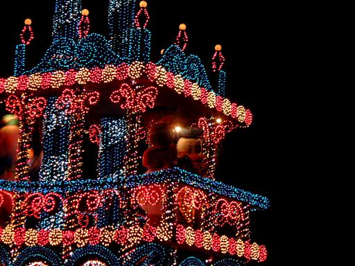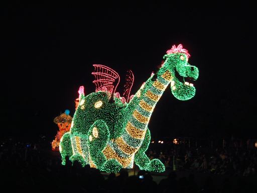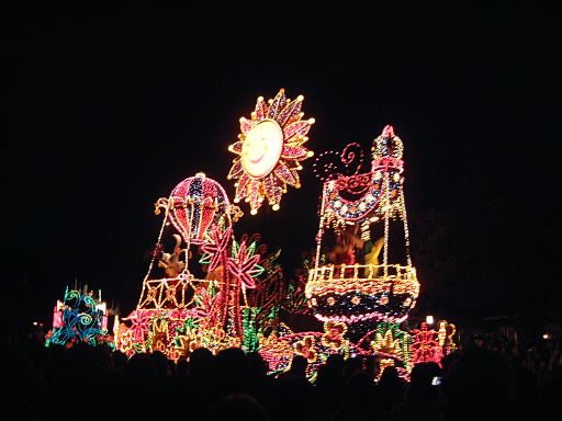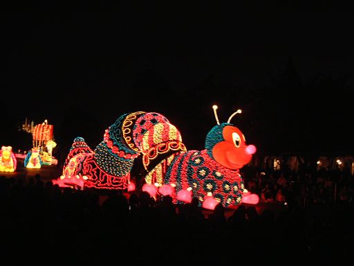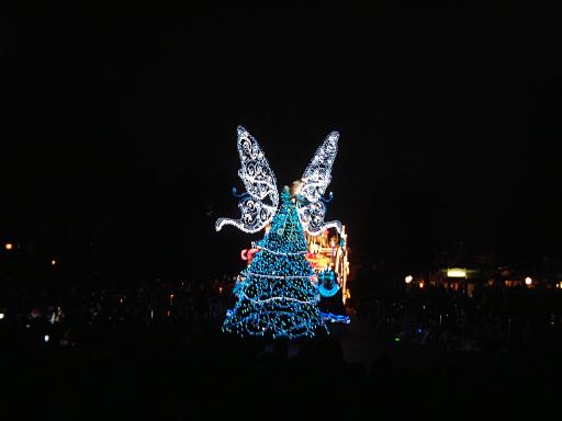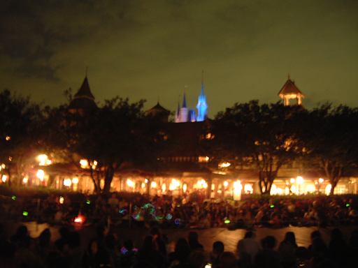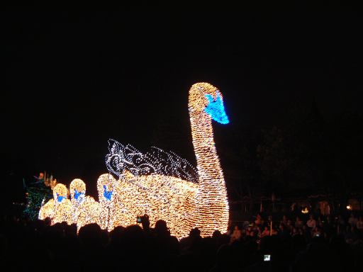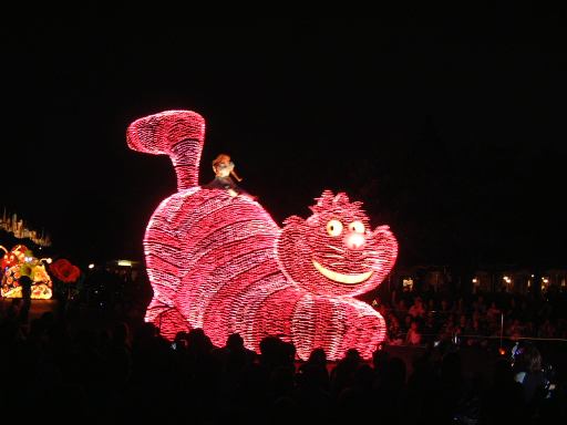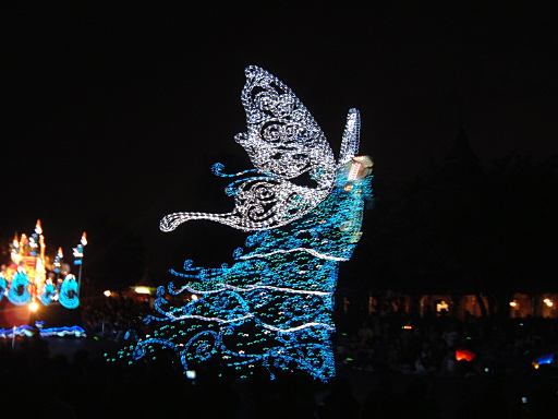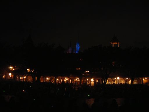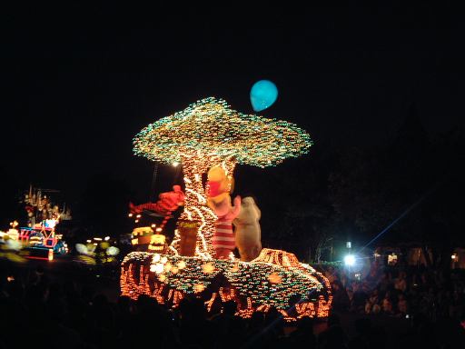 お腹を膨らました一行は、紫外線ビーム(<線とビームが重複)でスタンプ跡をチェックされ再び園内へ。そしてファストパスを使って「ビッグサンダーマウンテン」に乗車。暗い中で乗るとこれは数段楽しいことが解ります(ヤホーとか叫んでしまう)。山から降りてくると、ちょうどエレクトリカルパレードが始まろうとしていたので、曲り角の辺りにレジャーシートを敷いて陣取り、そのままパレードを観賞することになりました。通り沿いには毎度のごとく人だかりができ、辺りの照明は落とされ、遠くには浮かび上がるシンデレラ城が望めます。裸眼で見たらこんな光景ですが、夜景モードだとこんな感じです(ぶれてますが)。やがてアナウンスがあり、エレクトリカルパレードの始まり始まり〜。リズムパートの音楽が流れる中、メロディとともにパレードの先陣を切ってやってきたのは、妖精さん。近づいてくるにつれてメロディも大きく聞こえてきます。ミッキーを乗せた機関車がすかさず続いてドリームライツ!。その後ろからは、不思議の国のアリスを乗せた猫が続き、アリスは相変わらずオーバアクション。尺取り虫やドラゴンなんかが通り過ぎ、プーさんと愉快な仲間たちは愉快です。昼間のパレードでもそうですが、通り過ぎるキャラクタというかセクションによってメロディも変わります。スピーカを積んだフロートがあるんでしょうけど、それぞれのメロディがリズムパートにちゃんと同期していることに感動を覚えますね(今更言うのもなんですが)。美女と野獣はダンスを踊り、スワンが現れると音楽は白鳥の湖に。そしてドナルドたちを乗せたフロートが続いて、最後はピノキオとロージャーラビットがやってきておしまい。以上、どの写真もブレてて申し訳ないですが、やっぱり本物は違うなあと思い知るエレクトリカルパレードでした。