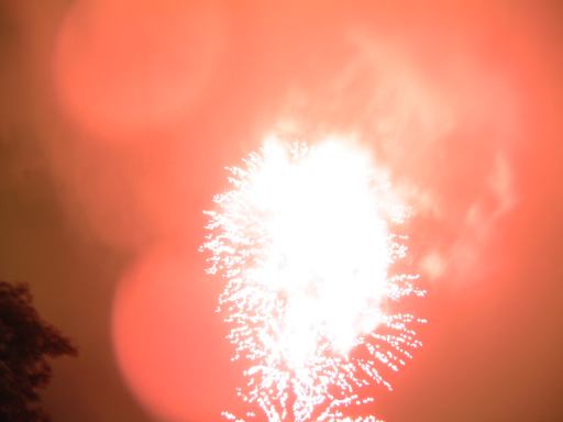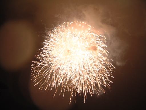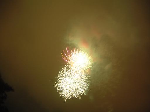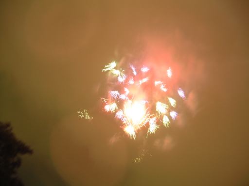 パレード終了後、冷えた躰を温めるため「グランマ・サラのキッチン」に入って、コーンポタージュやらコーヒーやらを飲んで小休憩となりました。そこで花火の時間まで待っていたのですが、開始時間が近づいてきていざ外に出てみると小雨がぱらついていました。雨足は少しずつ強くなり、花火の打ち上げが危ぶまれましたが、8時半には予定通り打ち上げられ始めました。実は最初、花火はシンデレラ城の上空に上がるもんだとばかり思っていた(そういう映像をよく見るから)ので、クリッターカントリー方向から来てダンボの辺りにいた我々(というか私)は、シンデレラ城の方向を見上げていたのです、木陰で雨宿りをしながら。そしたらあなた、スタッフらしき人に「花火はあっちから上がりますよ」と見上げていた方向とは真逆を指差しながら言われて、ちょっぴり恥ずかしかったじゃないですか(苦笑)。思わず、そっちかよ!ってひとりごちてしまいました。花火は「ホーンテッド・マンション」のある林の向こう側から上がっていたのです。考えてみればシンデレラ城から打ち上げるなんて危険なことは判るんですが、先入観とは恐ろしいものですね。とかなんとかはともかくとして、どんどん、どんどん、どんどん、どんどん、もひとつどん、と花火は雫落ちる夜空をバックに咲き乱れ、グランドフィナーレとなったしだい。