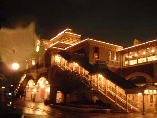 花火が終わった頃には、雨もしっかり降っていたので、あとはワールドバザールで土産でも買っていましょうということになったのですが、一緒にうろうろするのもなんなんで、その前に本日のオフ会は解散となりました。参加された皆様お疲れ様でした。なかなかに楽しかったです。さて、土産の方はと言いますと、いつものことですが大したものは買わず、耳カキ2つとハロウィンミッキーの飴のみでした。しかも自分用。そうしてディズニーランドを退園し、リゾートラインのディズニーランド駅に向かおうとしたその時でした! ライトアップされた駅を何気なく撮った写真に、あのキティちゃんが写ってるじゃないですか! キティちゃんの怨念でしょうか(笑)。何故キティちゃんから恨まれるのか根拠が薄いですけど。っていうか、レンズに付いた水滴のせいで、良い具合に写ってるだけですけどね(タネ明かし早いな<隠しても判るでしょ)。