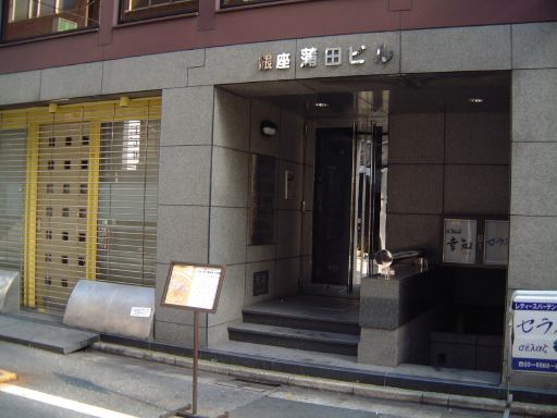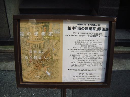 さて、佐久間氏のイラスト展は、もう一箇所、銀座の画廊「ボザール・ミュー」というところでも開かれていたのですが、実は本日が最終日だったのです。というわけで、そちらにも足を伸ばしてみることに。地下鉄で新橋まで行き、少し迷いつつも着実に歩を進め、午後2時頃「ボザール・ミュー」のあるビルに到着。画廊はビルの4階にあって全然目立たないところですが、知る人ぞ知る場所なのでしょう、きっと。表に展示会の看板が立っていたのでそれと判ったようなものです。エレベータで4階に上がり、降りてすぐ右手に画廊の入口がありました。想像していたよりもかなり小さいところです。人がすれ違うことも難しい通路からドアを開けて中に入ると、佐久間氏本人らしき人が挨拶をしてくださいました。おお、いきなりご本人にお会いできるとは。結構若い感じです。生年は確認していたので歳が自分と近いことは知っていましたが、イメージしていたよりも普通の好青年という印象。ここに飾ってあるイラストが一応本物の原画(一枚目に刷ったもの)ということになっているそうです。しかし本物も書店にあったものも作り方が同じなだけに、その違いは微妙です。それらイラストと一緒に、氏の過去作品のファイルなども置いてあって、度々描かれる共通のモチーフの元となっているものなんかも確認できました。お客さんは混雑するほどではなかったものの、佐久間氏の友人らしき人や、デビュー当時からのファンの方や、森先生のHPで知って来た人などがひっきりなしに訪れていました。原画とその他の作品を充分に堪能して、最後に売られていたポストカードと「猫の建築家」を購入。本には直筆サインをしていただけました(わーい)。ご本人とイラストについての会話も少しできましたし、来た甲斐があったというものです。直接話してみて、イラストに人柄がよく現れているのが判りました。実に繊細で素敵なお兄さんです。画廊にはオーナらしきおばさんも居て、お茶を出してもらったりもしたのですが、結局飲まずに画廊をあとにしたのが唯一の心残りです。ちょっと飲むタイミングが難しかったもので・・。ちなみに画廊のある裏通りはこんな感じでした。