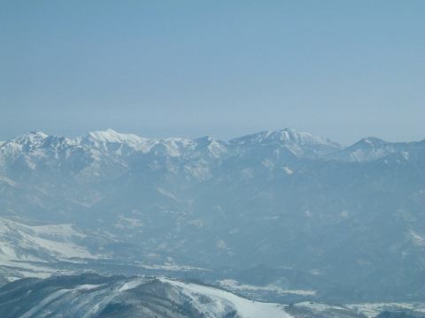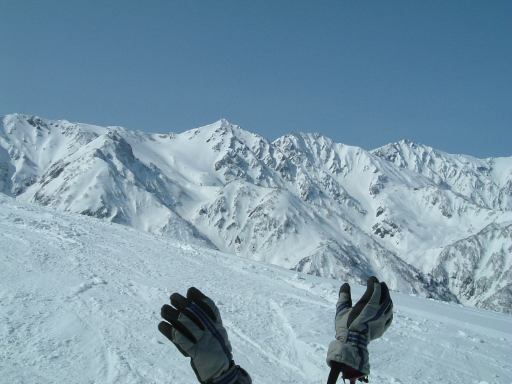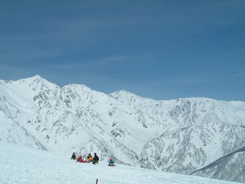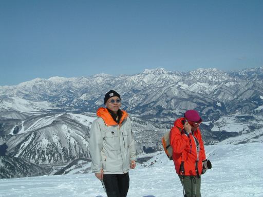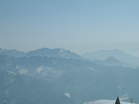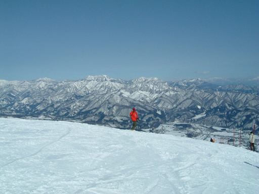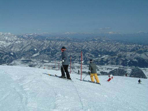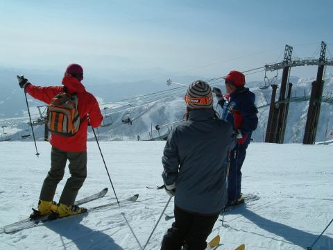 ゲレンデに着いてからはお昼の集合場所を決めて班ごとに午前中のスキーをすることになりました。うちら家族班はとりあえず山頂(というかリフトで行ける一番高い場所)まで登り、景色を眺めつつ一度下まで滑って汗だくになり、いきなりですがレストハウスで休憩。疲れたら休む、楽しく滑るための基本ですね。そうして少し休んだのち、もう一度上って滑っていたわけですが、そのときでした。他の班にいた女性メンバが一般のスノーボード客にぶつけられ、怪我をしたという連絡が入ったのです。ああなんということでしょう。初日から怪我人が出てしまうとはですよ。詳しく話を聞いてみるとやっかいなことに目の周りを怪我しているらしい。しかもコンタクトレンズが眼球に入ったとか入らないとかという話まで出ています(うへぇ)。予断は許さない状況でしたが、すぐさまパトロールが呼ばれたようでした。ちなみに他の班と連絡を取る父親の様子がこれ。その手前で下界を見据える母親と妹(カッコイイな)と、なんか怪しい中国人(苦笑)。ほんとに元スキー部か?と疑われるくらいだらしない姿をしていますね。帽子ぐらいまっすぐ冠ってほしいものです、まったく。恥ずかしついでにもう一枚(父親とともに)。うちらは直接見ていないので、どういう状況なのかは聞いて想像するしかなく、怪我人の心配はするものの落ち着いたものです。離れたところで騒いでも仕方ありませんからね。怪我人はその班の代表者に任せて、他の班の人たちは滑り続けることになりました。ただ、直前の滑走で転んでいた妹君は、ちょっと凹んでいましたが(笑)。という写真を撮って綺麗さに気づいたこちら方向の景色をもう一枚。ま、こんな写真を撮ってる余裕はあったということですね。