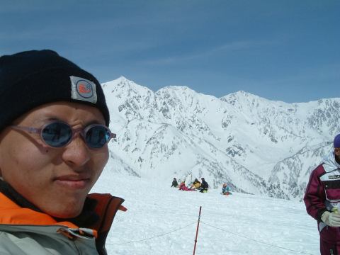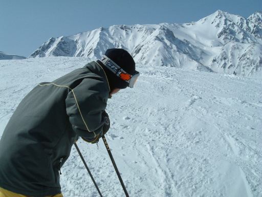 (3/23) 合宿最終日の日曜日はさらに早い時間から滑ろうということになり、午前6時には起床して、スキーの準備と部屋を出る準備を整えてから朝食に臨みました。天気は3日目も雲ひとつない快晴です。本日も名木山から山頂まで上って、状態の良いギュッと締まった斜面を数本気持ち良く滑ることができました(にこにこ)。人が少ないうちにしかできない大回りのカービングターンも楽しみ、もうこれ以上無理!ってぐらいスピードを出していましたね。その分、一気に太ももに疲労が溜まったわけですが(苦笑)。せっかく天気が良いので山の上で写真も撮りました。町のある谷方向を見るとこんな景色で、ちょっと東を向くとこうなって、さらに東を向くと「あそこがあれですわ」と話していて、反対側を見ると白馬連峰の山々が間近に見えています。そしてさらに西を向いて、カメラを引くと現れるのはだれ?(笑) 眩しそうです。
