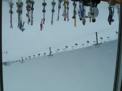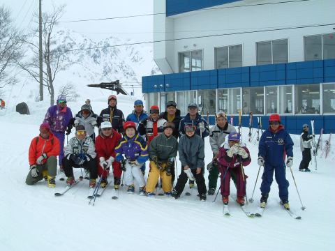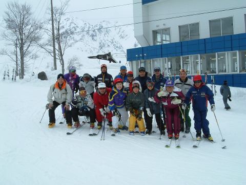まずは山頂まで上って、まだ人がそれほど滑っていない整備された斜面を気持ち良く何本か滑った後、咲花(さっか)ゲレンデの方に下りてゆき、途中で他の班と合流。レストハウスで休憩があり、椅子に座ってエビ反りで曇天を眺めるとこれな〜んだの景色。休憩後、集合して記念撮影を一枚・二枚と撮りました。ベテランばっかりです(他意はありません)。そのあとはちまちまとした講習を一緒になって受けて、ビデオもそこそこ撮影されました。うーん、でもしかし、こういう講習めいたものは、正直言ってあまり楽しくありませんね。今回は検定を受けるための合宿というわけじゃないですし、もっと伸び伸び滑れた方が有意義だったかもしれません。そんな講習の途中でしたが、妹のY氏が転倒して突き指をしてしまいました。ついてませんね。これでまたY氏はちょっと凹むことになったのですが、すぐにレストハウスに行って休憩がてらテーピングをして、スキーはなんとか続行できるように。我が妹ながら我慢強くなったもんです(笑)。2月にしていたスキーバイトが良い刺激になったみたい。