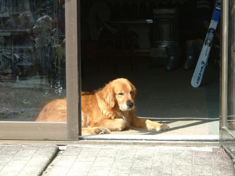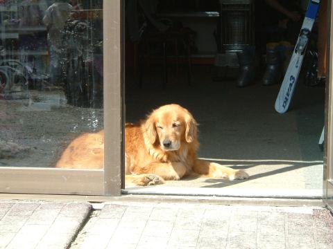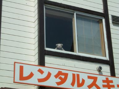 爽快に滑って一汗かいたのち、9時ぐらいには他の班のメンバたちと合流し、集合写真を撮ったり山頂に上って写真を撮ったりしてから滑り出しました。最終日は特に何かを修得しようとこだわるのではなく、みんなで長い距離をわいわい滑ることになり(昨日の反省を踏まえ)、なかなか楽しかったです(体は辛かったですが)。お昼頃にはスキーは切り上げとなり、咲花ゲレンデからシャトルバスで宿の近くまで戻ることに。バスを待っている間、レンタルスキーショップに看板(?)犬を発見しました(眠そうです)。と写真を撮ったら気づかれた? さらに何か視線を感じるなと思っていたら、なんと2階の窓から覗かれていました(笑)。これはクマさんでしょうか。