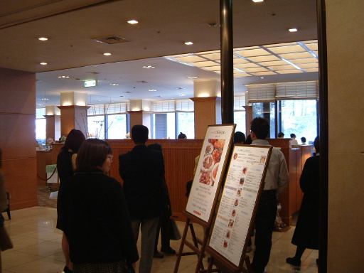 入口の自動ドアから中へ入りさっそく集合場所となっているお店ブローニュを探します。周りを見るとロビィにはちゃんとした服装の人たちがうろうろしています。結婚式かなにかが行なわれているのでしょう。勘を頼りに歩いて行った方向に(というかスペースのありそうな方向に歩いただけですが)目的のブローニュはあり、その入口の前にはすでに那古野コネクションのメンバが集まっていました。とりあえず幹事のKずえさんには「遅くなりました」と恐縮混じりにご挨拶。そしたらまだ来られていない方が他にもおられるとのことで、ほっと一安心(笑)。あとその場におられたのは、Tさん、Mつるさん、Fさん、Gんてつさん、Mさん、Lさん、Aすましさんでした。残りの参加者を待っている間、名刺交換をできる方とは行ない、それからMつるさんからは銀のエンゼルも1枚お預かりしました。そのうちにAなあなさんがやって来られ、今回大阪から初参加となるKさんも来られて(スーツにサングラス姿でどこぞの黒服かと見紛う出で立ちで登場!)全員集合となりました。そしてブローニュの入口から中へ。見ての通り、扉があるわけではなく、出入りはシームレスです。