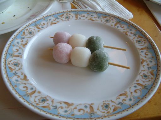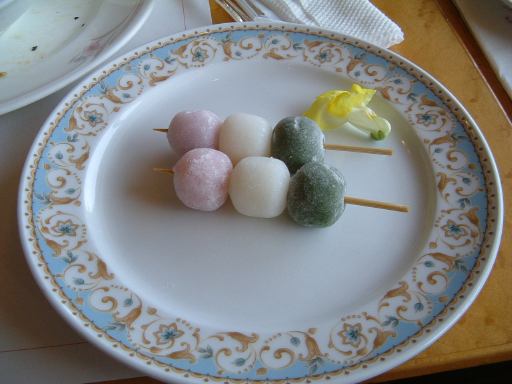 案内された席に座ってみると、偶然テーブルの向い同士に男女が別れて座る形になり(Kずえさんは男性側でしたが)、さながらコンパかお見合いですね〜みたいな話に。ここのランチはバイキング形式なので、料理を自分で取りに行く必要があったのですが、全員一斉に席を離れてしまうのもセキュリティ上好ましくないということで、まずは女性陣側に座っておられた方々が料理を取りに行くことになりました。しばらくするとお皿に盛られた料理がテーブルの前に置かれていきます。しかしみなさん取ってくるばっかりでなかなか食べ始めません(笑)。程よいところで残っていたメンバも席を立って料理を取りに行きました。最初に目に付いた料理は、目の前でシェフが取り分けてくれている肉にソースがかけられた料理でしたが、基本的に肉はパスなのでそれはちらっと見た程度。何の肉かも判りません。最初に手に取ったのは、その隣にあったカレーライスです(にっこり)。深皿にご飯を盛って上からカレーをかけるのです(なんか普通の説明をしてるな)。それとつい出来心で近くにあった三色団子も1本だけ皿に乗せて席へ帰還。まだ食べません。それらを一旦置いておいて、さらにサラダ風の料理と飲み物のコーヒーを取りに行きました。それらを揃えてからようやく食事開始です。タイミングが悪くちょうど人が多いときに料理を取りに行っていたので、ここまでに10分以上かかってしまいました。お腹もすっかりスキスキです。