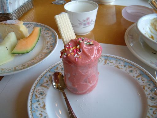 さて、最初に口にしたのはカレーライスでしたが、さすがホテルのレストランだけあって、辛さも香りも控えめな上品な味でした。匂いはカレーなんですが、どちらかというとシチューのような味なのです。まろやかです。その次に食べた三色団子も(食べる順番お構い無し)こし餡が入っていて美味しくいただきました(森先生にとっては信じられない食べ物でしょうけど)。これは後ほどもう2本取ってきたほどです(笑)。団子だけじゃ寂しいということでTさんに花を添えられもう一枚。肉以外の料理としてはカニの足もあったのですが、殻から中身を取り出すのが面倒臭くて取らず。食事中も名刺交換を行ない、Lさんからは銀のキョロちゃん2枚をお預かりしました。食事の後半になってサラダバーから取ってきたサラダは胡麻ダレでいただき、デザートはチーズケーキとメロンとソフトクリームです。他の料理は控え目でも、デザートになるとテンコ盛りの人もいます(笑)。ちなみにソフトクリームは自分でカップの中にウィ〜ンと出して、トッピングとかも加えられるようになっているのですが、自分の作ったソフトクリームはこんな感じ。クリームが紫色なのはこの日のクリームがこれだったからです(選択肢は無し)。何味だったか覚えていませんが、グレープかイチジクかそんなところでしょう。バイキング料理は、普段ならこれでもかってくらい食べるのですが、今回は食後のツアーのことも考慮して控え目にしておきました。というか、そう思ったときには結構お腹いっぱいになっていましたけど。最後のほうはまったりとした時間が流れ、制限時間を使い切ることもなくランチタイムは終了となり、会計係を引き受けてくださったGんてつさんに各々4000円ずつ渡し、支払いをお願いして一行は店を出ました。いやあ、美味しくてすっかり満足してしまいましたが、まだまだツアーは始まってもいません(苦笑)。うへぇ〜(<嫌なのか)。