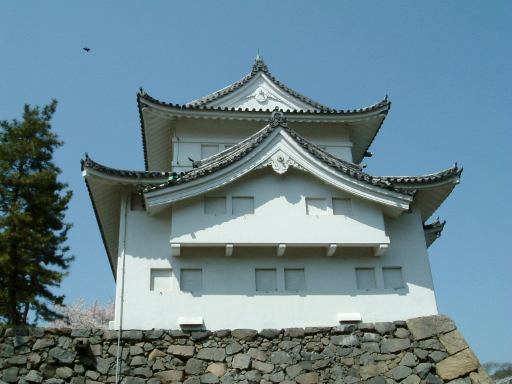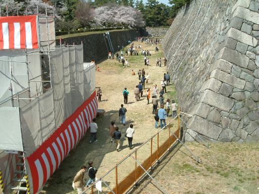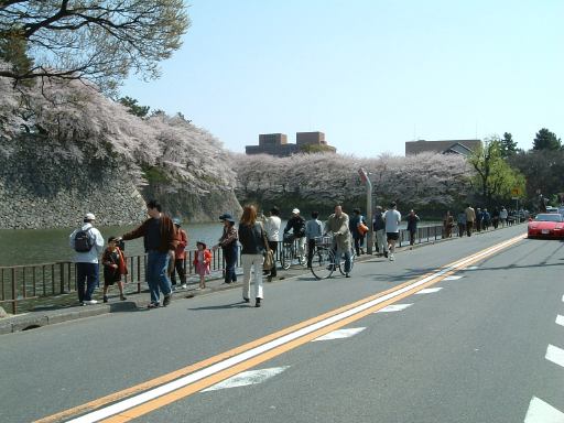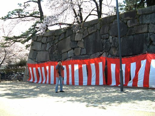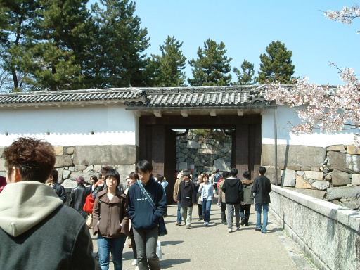 東門へと続く二之丸の通路の真ん中には梅林があり(垣根で見えませんが)、その左側(北側)を歩きます。梅林の反対側には二之丸広場があって、遠くには天守閣が見えています。梅林を通り過ぎると、通路はぐんと広くなり、右手(南側)には藤棚(花は無いけども)があって、その先に東門が見えてきました。しかし見えれば充分です。近くまで行ってじっくり観察している時間はありません。というか、少し前にすれ違ったTシャツを着たゴールデンレトリーバーの方が気になったので(笑)、振り返ってみると水を飲んでいるところでした(にこにこ)。この陽射しの中Tシャツを着せられて暑いでしょうね。というわけで東門を遠目に見つつ、ぼたん園の手前の通路を抜けて北上します。すると目の前には二之丸東庭園が広がっていました。窪地が池のように見えますが、水が溜まっていたようには見えないのでそういう見立てなんでしょうね(いわゆる枯山水?)。その庭園を横目にさらに北上して行くと、左手に細い脇道があり名勝二之丸庭園(その北側の端っこがこんな感じ)へと続いていましたが、通り抜けはできなくなっていたので、北側の通路へ迂回することに。ここにある桜も満開です。北の通路からは外堀を見下ろすことができ、咲き具合が異なる桜が並んでいました。道沿いに進んで今度は南へ向かって歩きます。その途中には埋御門跡があり、実際の跡はこれ(判りにくいですね)ですが、埋御門が何のことだか解りません(<説明文をちゃんと読みましょう)。ただ、そこから見えるお堀は氷河地形のU字谷のようです(関係無し)。さらに風が吹いたりすると桜の花びらが散って印象的な眺めに。このお堀に沿って今度は西に歩き、少しずつ本丸に近づいていきます。しかし突き当たったところは内堀になっていて、そこで右折し再び北上しなければなりません。さすが本丸、そう簡単には入れませんね(<っていうか、わざと遠回りしてるし)。石垣の間をくねくねと抜けると右手にくるみ林(手前の黒いのじゃないですよ<言わなくてもわかる)が見え、その正面にある内堀に掛かる橋の先に旧二之丸東二之門がありました。裏門みたいなものでしょうか。表二之門に比べるとかなり貧弱です。ここからいよいよ我々3人組は本丸に入り、天守閣を攻めることとなったのでありました。まだまだ先は長い・・。