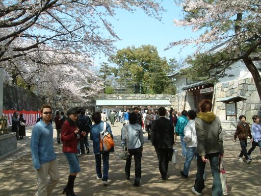 正門から入ったところが西之丸です。西之園ではありません(<さすがにそれは妄想し過ぎ)。ぞろぞろと歩くのもなんなんで、以降はいつものように集合時間を決めて城内は自由見学をすることとなりました。みんなそれぞれ桜のように散っていきます。正門からそのまま正面を向いた方向が東ですが、そちらに広い通路が伸びていて、端には満開の桜を見ることができます。いくつか種類があるようで、垂れ下がり気味の桜は少し濃いピンク色でした(八重桜?)。自由見学といってもさすがに独りじゃ寂しいので、同じ方向に歩いておられたKさんとAすましさんと一緒になって、その後の名古屋城見学は3人で回ることに。他の人たちの様子は当然判りません。Kさんは名古屋城を訪れるのは初めてなので案内してほしいとのことでしたが、名古屋に住んで5年目になる自分も、実は初めて中に入ったのです(笑)。以前正門の前までは来たことがあるんですけど、そのときは閉城時間を過ぎていて中には入れなかったのです。というわけで、とりあえずパンフレットに描かれている道順に従って見ていくことにしました。