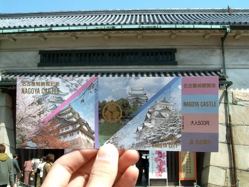 さて、腹ごしらえを終えた一行は、午後1時頃にはウェスティンをあとにし、いよいよ名古屋城へと向けて歩いていきました。お堀の周りの桜を眺めながらお堀に沿ってどんどん歩き、角を曲って途中でボーイスカウトの集団に抜かれつつさらに歩いて名古屋城の正門前へ。記念写真を撮る人もいます(<そんなのを撮る人はだれ?)。ここで会計係のGんてつさんが観覧券をまとめて購入してくださり、各自受け取り正門をくぐって入城となりました。ちなみにその観覧券には名古屋城の四季が印刷されていて、こんなところに森ミステリィとの符合が?!といちいち妄想しているのは誰でしょうか(笑)。入るときにパンフレットもごっそりゲットしました(取り過ぎ)。