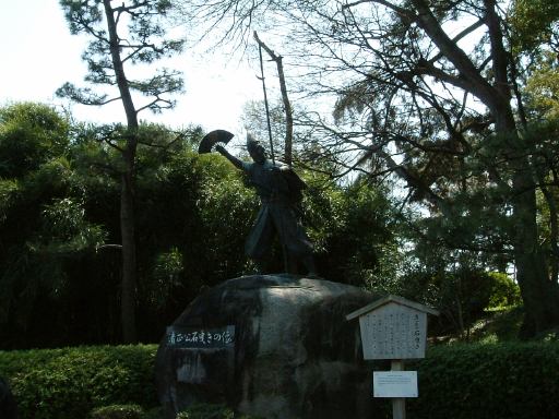 まずは広い通路を東に歩きます。遠くにすでに天守閣も見えていますが、その手前、本丸の南西側に大きく見えているのが西南隅櫓です。未申櫓ともいわれるそうですが、歴史に疎いので何のことだか解りません(苦笑)。本日はちょうど「しろの日」らしく(最初「白の日」と脳内変換してしまったため意味不明でしたが「城の日」だったようです)、その西南隅櫓の横の内堀に仮設の階段が設けられており、特別に堀の中に降りられるようになっていました。自分たちは降りなかったのですが、どんな感じかと下を覗いてみると、ちょうどそこにはMつるさんとMさんの姿が(どれでしょう?)。おお早くもあんなところに。という呑気な感想を抱きつつ我々3人組は引き続きぶらぶらと東に歩き、やがて見えてきたのが本丸への入口のひとつになっている表二之門。パンフレットにはここから本丸に入る順路も描かれていますが、なるべくいろいろ見るために、ここはパスしてさらに東へ行くことにしました。ここで通路は一度狭くなり、左手(つまり本丸の南東にあたる場所)には東南隅櫓が大きく見えます。これは辰巳櫓ともいわれるそうです。と書いて気づきました。「未申」とか「辰巳」というのは方角を表しているのですね。狭い通路を抜けると、そこは二之丸です。右手には、名古屋城の石垣に使う石を引くときに音頭をとったという逸話がある加藤清正の像(清正公石曳きの像)が、ひっそりと佇んでいました。日陰になって全然目立ちません(笑)。反対側のお堀に何故かいる鹿たちの方がよっぽど目立ちます。自然にこの中に入ったとは思えませんが、鹿を入れる必要性も想像できないので、もしかしたらもしかするかもしれません。不思議です。