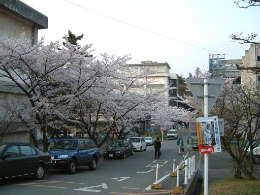 水曜日は午前9時に起床、スパゲティにシーチキンとゆかりを混ぜたものを朝食に食べ、11時半頃大学へ。会社勤めの方から見れば鼻で笑われそうですが、比較的早起きが続いております。えらいえらい。午後は那古野コネクションのレポートの続きを書き続け、3時頃一旦休止。そしてU本君とアイソトープセンタの液体窒素を汲みにいきました。戻ってきてからもレポートはしこしこしこと続きます(何をしに大学に来てるんだ)。生き抜きがてら、夕方頃に閉店間際の生協へ行って食料を調達してきました。その帰りに今年の満開の桜を撮影。名古屋に来て5年目の春ですね(しみじみ)。