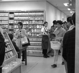 そして4時少し前いよいよ森先生のご登場となりました。やはりいつものサングラス姿です〜。列の後方からお見えになった先生は、用意されていた小さな机(上には森ぱふぇスタッフからのお花が)を前に座られ、書店のスタッフによる始まりの挨拶があり名刺交換会が始まりました。沸き起こる拍手(パチパチパチ)。一番先頭に並んでいた人の名刺交換の様子を確認してから、ブツを渡すために他の森ぱふぇスタッフを探してフロアをしばらくうろうろ。戻っては名刺交換の様子を傍から見たり遠くから見たり(意図的に白黒)していました。同じような人が周りにはたくさんいて、近くの本棚の間が通れなくなっていることもあったりです。そのうちにTさんやMさんがやってこられ、ブツも無事お渡しすることができました。他の人が結構「赤い名刺大作戦」に参加して赤い名刺を作って来たことを知ったMさんは、急遽ご自分の名刺の裏一面に赤ペンでハートマークやらラブメッセージやらを書くことを決意され(笑)、近場の台を使って貧血で倒れるんじゃないかというくらいの勢いで、名刺の裏を赤く埋め尽くされていました。