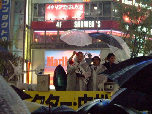 さて、夜はお昼に電話で話したK藤氏と待ち合わせていました。場所は渋谷のハチ公前。そこでは雨だというのに人が溢れ返っていて、人の傘が邪魔邪魔邪魔。なので自分は傘をささずです(あとでさしましたけど)。なんだか煩いなと思ったら、東京でも選挙が近いらしくドクター中松氏が街頭演説をしていました。手には5インチのフロッピィディスクを持ち、必死に「偉大な政治家はみんな発明家である」みたいなことを力説しておりました。うーん、あなたは確かにすごいけど、5インチフロッピィを未だに引っ張ってるのは格好悪いなと思いましたね。おそらくもっとすごい発明もしているはずなのに、そんなに昔の発明品を出されたら聴いてる方としては、今ではまるっきり衰えているみたいな印象を抱きかねません。それしかないのかなと。そんな衰えた人に政治を任せようとは思わないのでは? もっと先のビジョンを見せて国民を納得させるのが政治家というものじゃないのでしょうか。たとえ偉大な政治家がみんな発明家であっても、必ずしも発明家が偉大な政治家になるわけではないのは自明です。ま、東京都民ではないのでどうでもいいですけど。さらに言えば名古屋市民でもないので今回の選挙には行けないでしょう(まだ住民票移してなかったのか)。文句は投票してから言いたいと思います(散々言いましたが)。